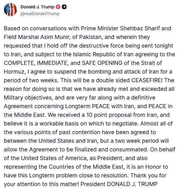 अमेरिकी राष्ट्रपति डोनाल्ड ट्रंप ने 14 दिन की सीजफायर की घोषणा की है हालांकि यह खबर अखबारों में नहीं है क्योंकि यह ऐलान उनके छपने के बाद किया गया। बीबीसी के अनुसार पाकिस्तान की मध्यस्थता में अमेरिका और ईरान दो सप्ताह के युद्धविराम पर सहमत हो गए हैं. अमेरिका के राष्ट्रपति डोनाल्ड ट्रंप ने कहा है कि पाकिस्तान के नेतृत्व के साथ हुई बातचीत के बाद, अगर ईरान होर्मुज़ स्ट्रेट से जहाज़ों की आवाजाही की अनुमति देने पर सहमत हो जाता है, तो अमेरिका और ईरान के बीच युद्धविराम हो जाएगा. उन्होंने कहा, “मैं ईरान पर बमबारी और हमले को दो हफ्तों के लिए रोकने पर सहमत हूं.” ट्रंप ने कहा कि इस युद्धविराम पर दोनों पक्ष सहमत हैं.